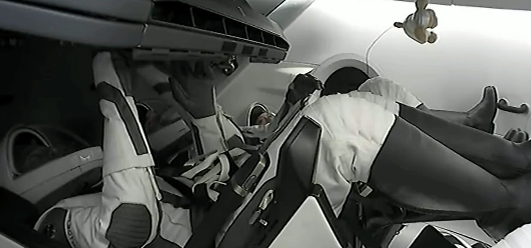 In the cabin of the Crew Dragon was also a stuffed toy dog, floating as the fifth member of the team. A feature of this mission is a skylight of sorts in the Crew Dragon capsule, which SpaceX revealed in March. While there was supposed to be a view of the feature on the launch live stream, that didn’t go as planned, so we’ll have to wait a little longer to see that.