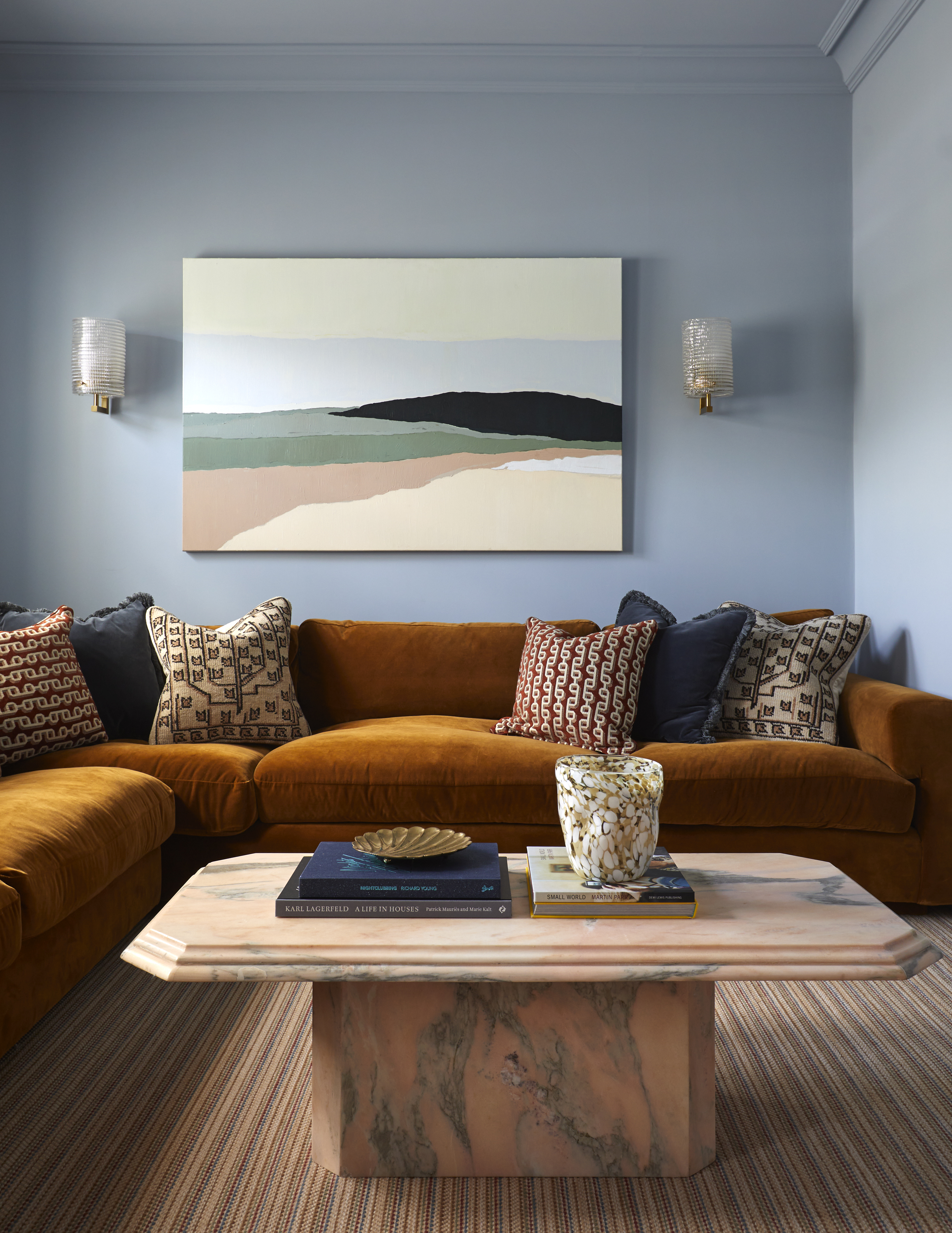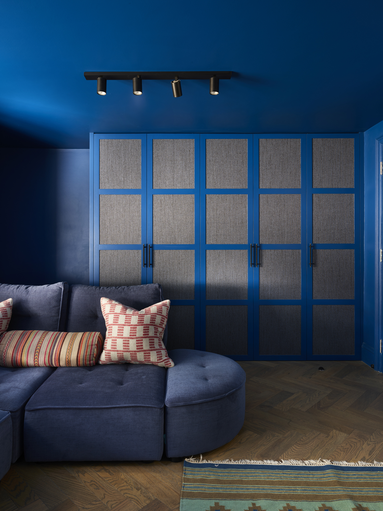 In the snug above, Studio Raymond opted to color-drench the space in Little Greene’s Deep Space Blue paint. “The result is a room that feels rich and immersive,” explains Carina.