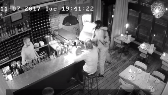 The attacker drops his hammer on the floor in the commotion. But upon returning for the weapon moments later, he is confronted by diners with bar stools.