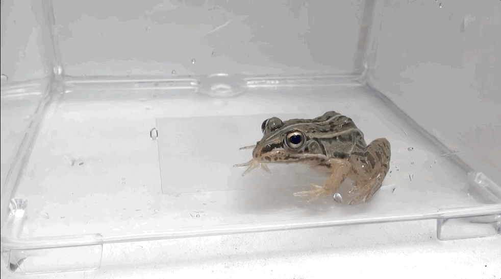 Many frog species, like Pelophylax nigromaculatus, or the black-spotted frog, used in the experiments, don't have teeth. It swallows prey whole, pushing it through its esophagus, stomach, small intestine, and large intestine. Whatever doesn't get digested is excreted through the frog's rear vent.