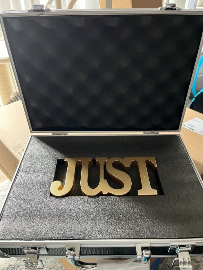 Review: "I couldn’t stop laughing when I saw this. In person it’s perfect. The briefcase is perfect and great quality material. The “just” is gold, and bright and perfect. Very fun and creative." - Heather