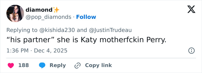 “Kate Perry really needs a wardrobe consultant. Or maybe she needs a history lesson. Justin is a former Prime Minister of Canada, whose father was a legend in global circles. That little ‘Shein’ outfit is not becoming. At all.”