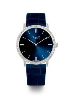 Baguette diamonds sparkle on bezel and quarter markers of the 36mm high-jewellery model, whose sunray-brushed dial in Piaget Blue, a shade between cobalt and midnight blue, creates a play of light and shade under varying levels of illumination.