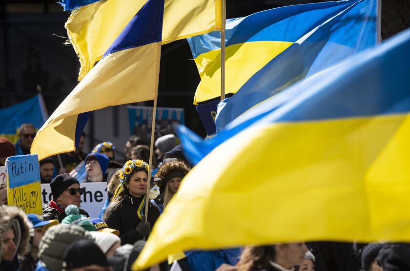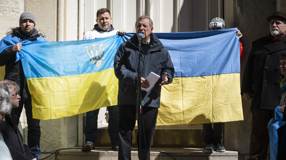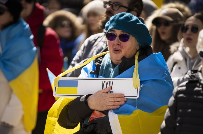 “These people are trying in every way possible to preserve their families, their homes and their love of Ukraine,” said Sen. Dick Durbin, D-Ill. “Can we do anything less than to stand out here on a chilly day, in the sunshine, in a peaceful setting and pledge our solidarity to the same cause? No. We need to stand together.”