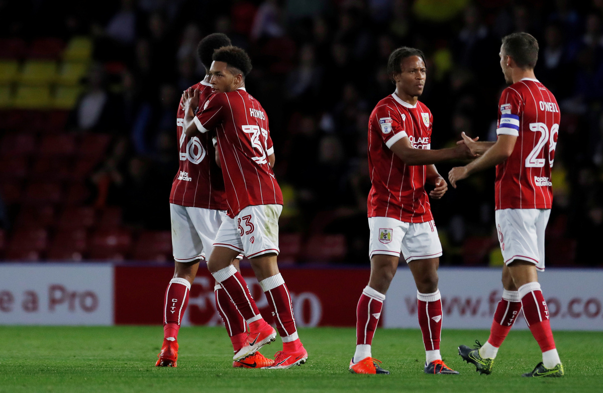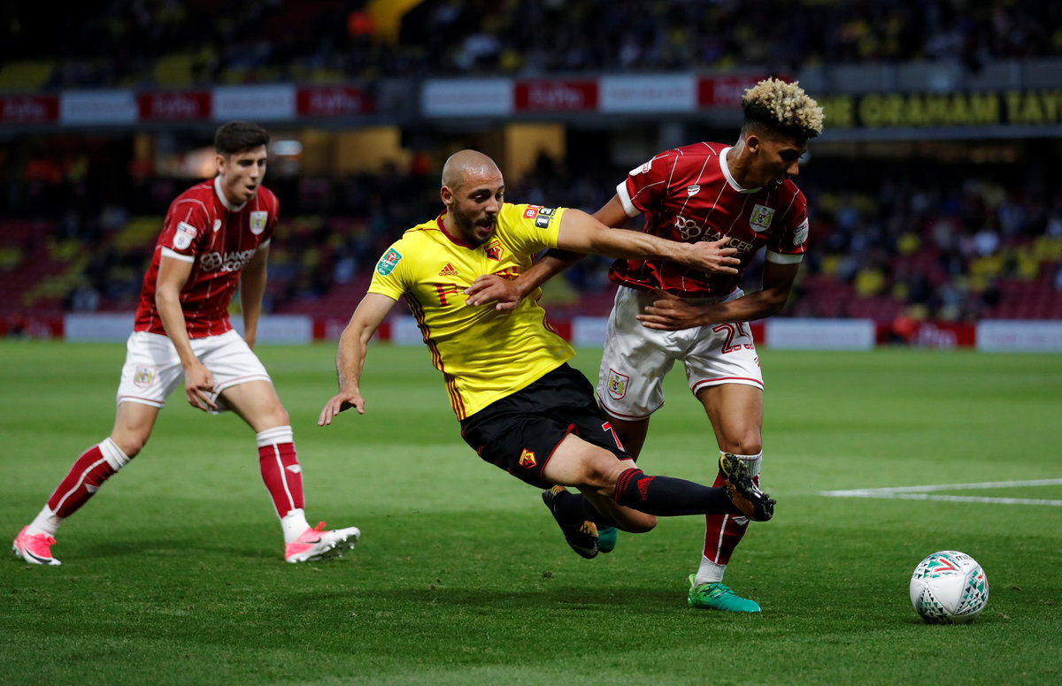 Soccer Football - Carabao Cup Second Round - Watford vs Bristol City - Watford, Britain - August 22, 2017 Bristol City's Lloyd Kelly in action with Watford's Nordin Amrabat Action Images via Reuters/Andrew Couldridge Soccer Football - Carabao Cup Second Round - Watford vs Bristol City - Watford, Britain - August 22, 2017 Bristol City's Freddie Hinds celebrates scoring their first goal Action Images via Reuters/Andrew Couldridge Soccer Football - Carabao Cup Second Round - Birmingham City vs AFC Bournemouth - Birmingham, Britain - August 22, 2017 Bournemouth's Brad Smith and teammates celebrate after the match Action Images via Reuters/Craig Brough Soccer Football - Carabao Cup Second Round - Sheffield United vs Leicester City - Sheffield, Britain - August 22, 2017 Leicester City's Ahmed Musa celebrates scoring their fourth goal with team mates Action Images via Reuters/Lee Smith Soccer Football - Carabao Cup Second Round - Crystal Palace vs Ipswich Town - London, Britain - August 22, 2017 Crystal Palace's James McArthur celebrates scoring their second goal with team mates Action Images via Reuters/Matthew Childs