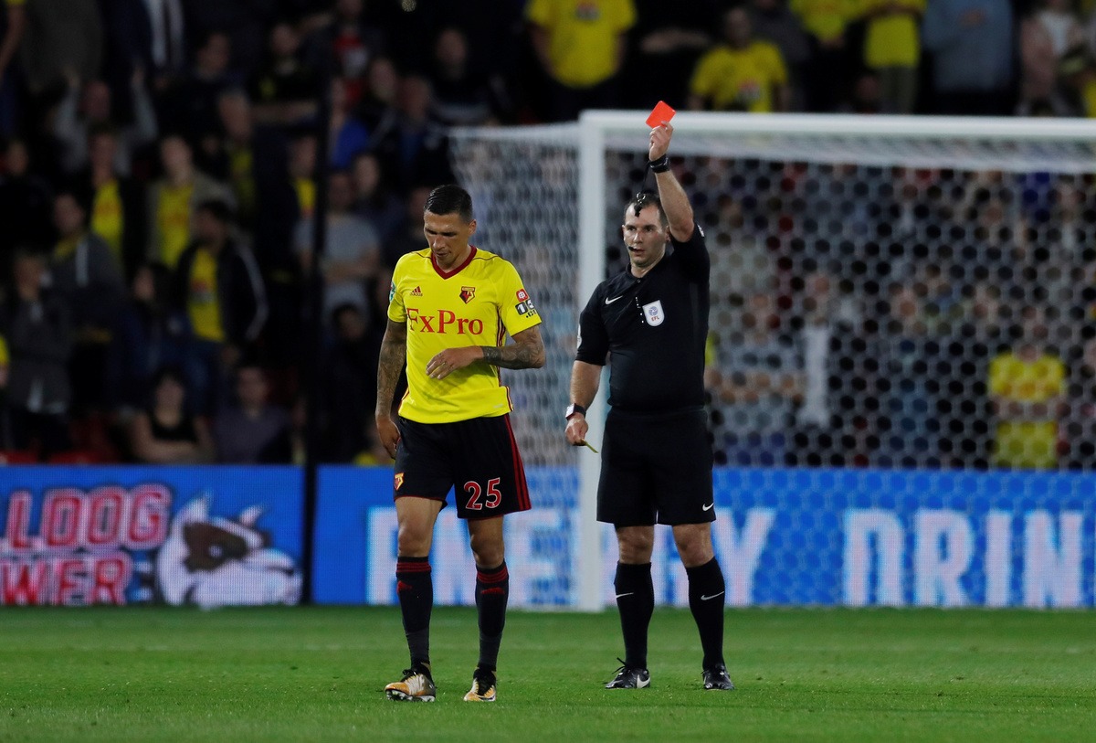Soccer Football - Carabao Cup Second Round - Watford vs Bristol City - Watford, Britain - August 22, 2017 Watford's Jose Holebas is shown a red card by referee Tim Robinson Action Images via Reuters/Andrew Couldridge
