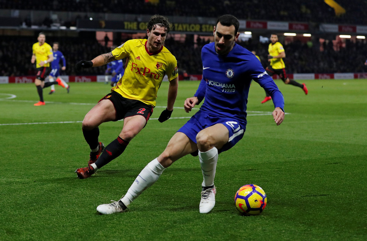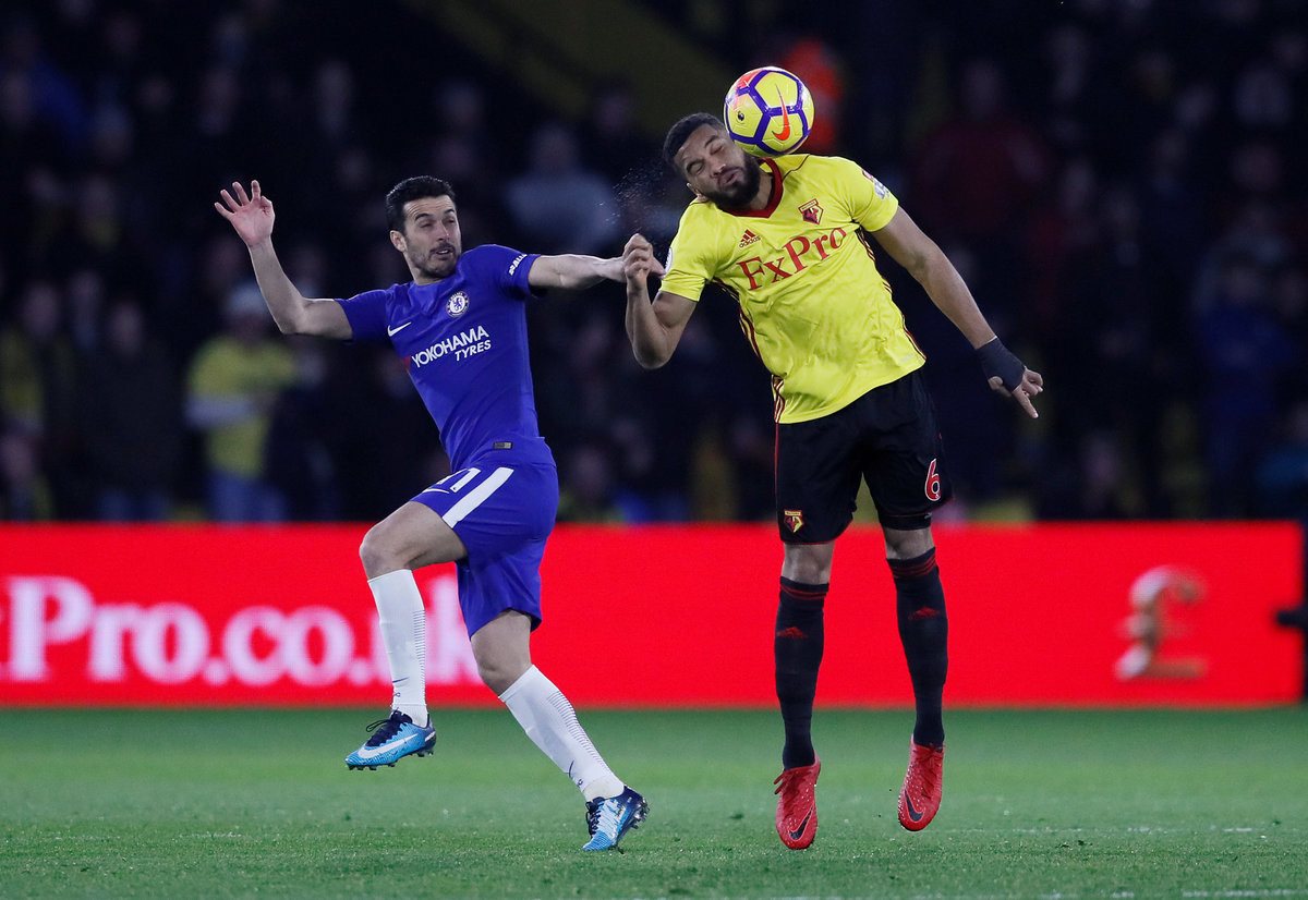 Soccer Football - Premier League - Watford vs Chelsea - Vicarage Road, Watford, Britain - February 5, 2018 Watford's Adrian Mariappa in action with Chelsea's Pedro REUTERS/David Klein