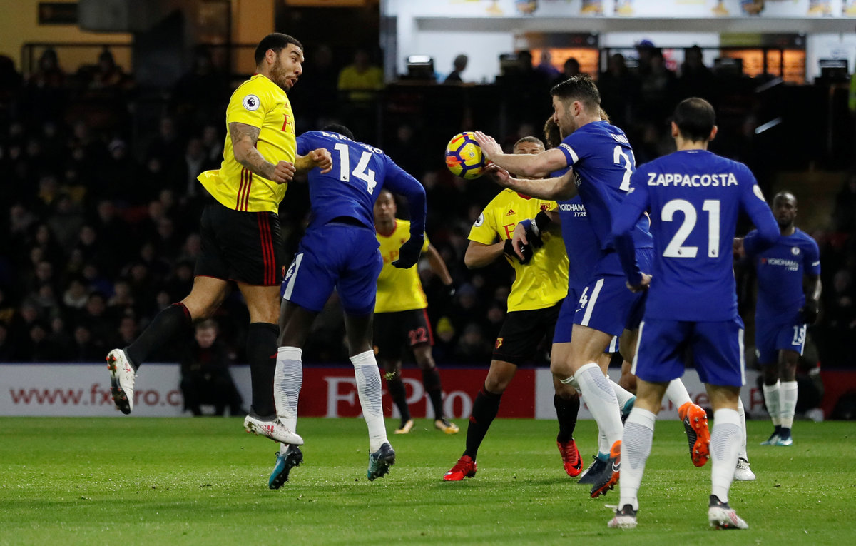 Soccer Football - Premier League - Watford vs Chelsea - Vicarage Road, Watford, Britain - February 5, 2018 Watford's Troy Deeney in action as the ball hits Chelsea's Gary Cahill REUTERS/David Klein