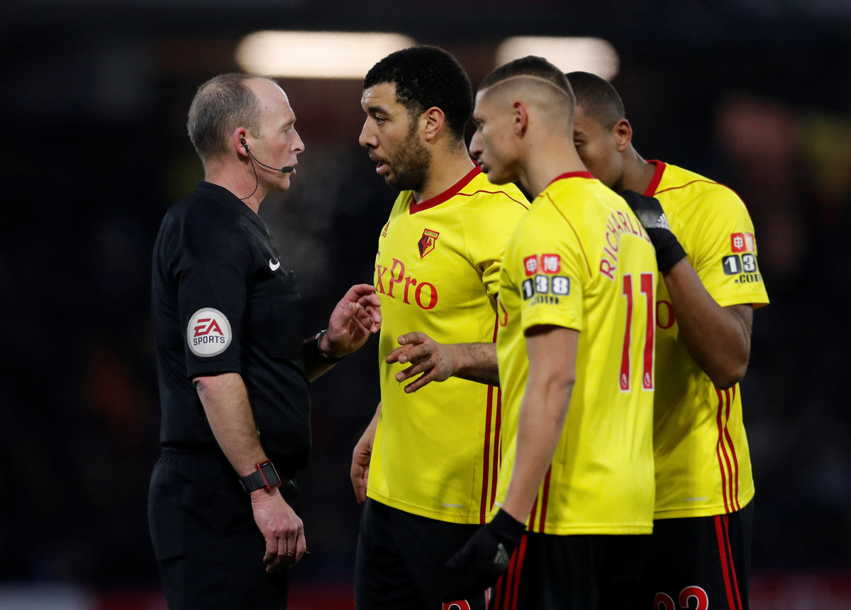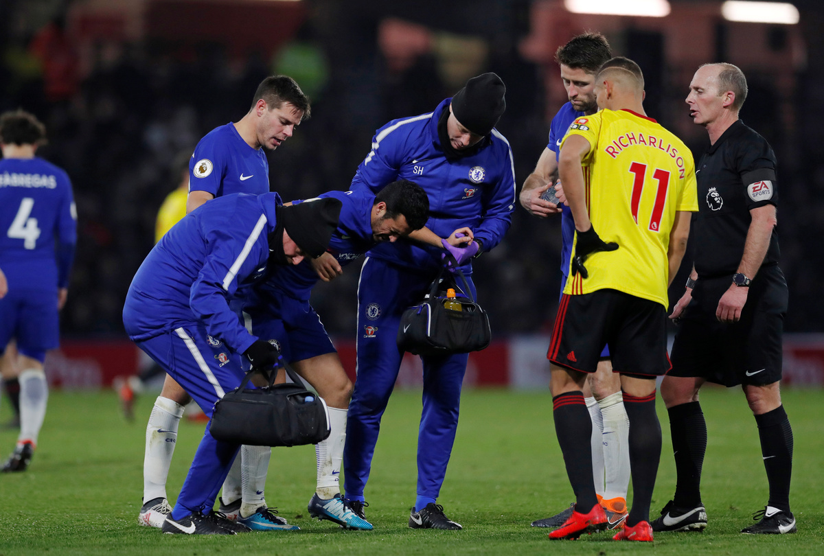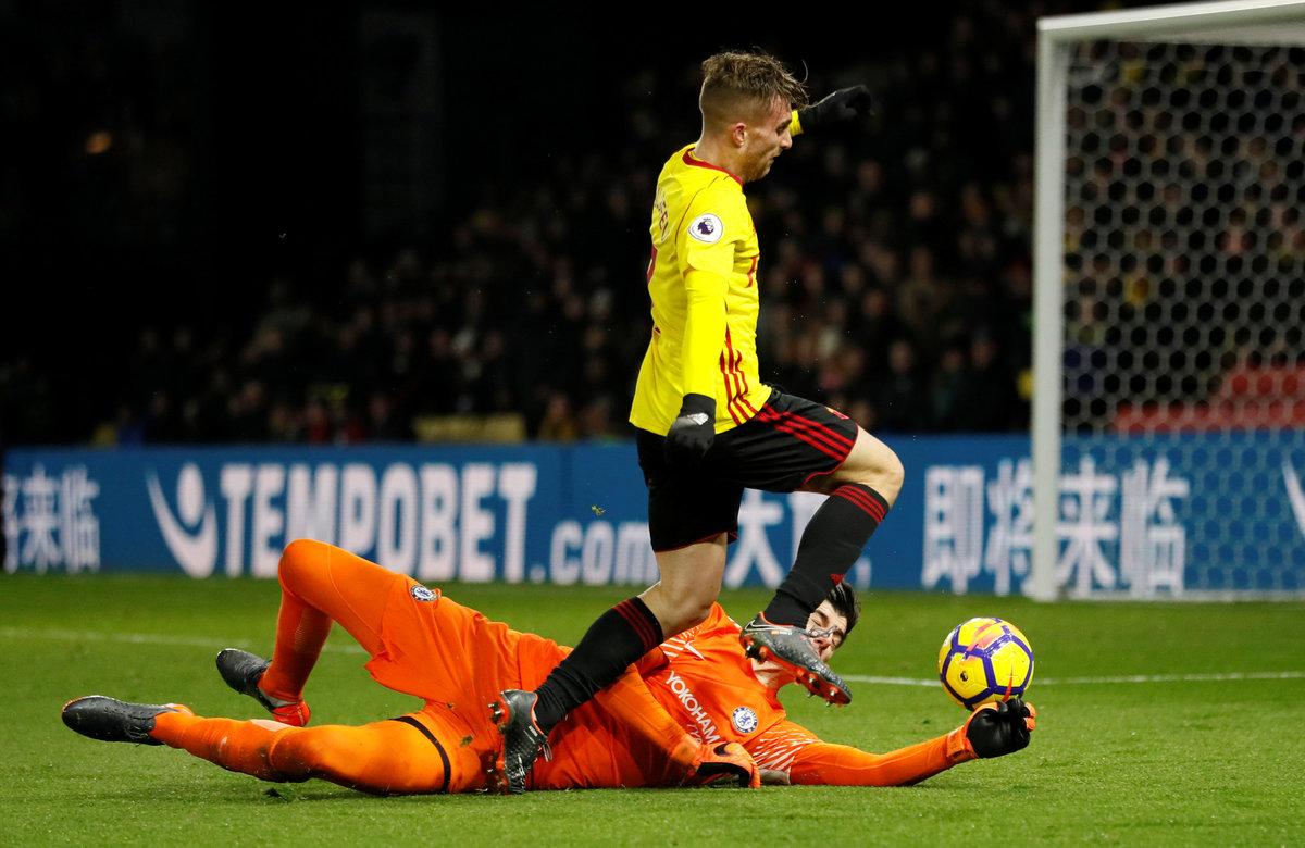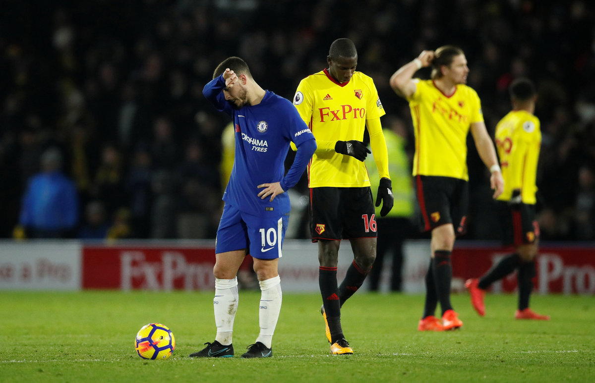 Soccer Football - Premier League - Watford vs Chelsea - Vicarage Road, Watford, Britain - February 5, 2018 Chelsea’s Davide Zappacosta in action with Watford's Daryl Janmaat Action Images via Reuters/Andrew Couldridge Soccer Football - Premier League - Watford vs Chelsea - Vicarage Road, Watford, Britain - February 5, 2018 Chelsea's Thibaut Courtois fouls Watford's Gerard Deulofeu for a penalty REUTERS/David Klein Soccer Football - Premier League - Watford vs Chelsea - Vicarage Road, Watford, Britain - February 5, 2018 Watford's Troy Deeney scores their first goal from a penalty Action Images via Reuters/Andrew Couldridge Soccer Football - Premier League - Watford vs Chelsea - Vicarage Road, Watford, Britain - February 5, 2018 Watford's Troy Deeney celebrates scoring their first goal REUTERS/David Klein Soccer Football - Premier League - Watford vs Chelsea - Vicarage Road, Watford, Britain - February 5, 2018 Chelsea's Pedro is helped off the pitch before being substituted as Watford's Richarlison looks on Action Images via Reuters/Andrew Couldridge Soccer Football - Premier League - Watford vs Chelsea - Vicarage Road, Watford, Britain - February 5, 2018 Watford's Troy Deeney and Richarlison speaks with referee Mike Dean Action Images via Reuters/Andrew Couldridge Soccer Football - Premier League - Watford vs Chelsea - Vicarage Road, Watford, Britain - February 5, 2018 Chelsea's Eden Hazard in action with Watford's Etienne Capoue and Abdoulaye Doucoure REUTERS/David Klein Soccer Football - Premier League - Watford vs Chelsea - Vicarage Road, Watford, Britain - February 5, 2018 Chelsea's Olivier Giroud in action with Watford's Sebastian Prodl Action Images via Reuters/Andrew CouldridgeSoccer Football - Premier League - Watford vs Chelsea - Vicarage Road, Watford, Britain - February 5, 2018 Chelsea's Eden Hazard scores their first goal Action Images via Reuters/Andrew Couldridge Soccer Football - Premier League - Watford vs Chelsea - Vicarage Road, Watford, Britain - February 5, 2018 Chelsea's Eden Hazard celebrates scoring their first goal with Cesar Azpilicueta REUTERS/David Klein Soccer Football - Premier League - Watford vs Chelsea - Vicarage Road, Watford, Britain - February 5, 2018 Watford's Daryl Janmaat scores their second goal Action Images via Reuters/Andrew Couldridge Soccer Football - Premier League - Watford vs Chelsea - Vicarage Road, Watford, Britain - February 5, 2018 Watford's Gerard Deulofeu scores their third goal Action Images via Reuters/Andrew Couldridge Soccer Football - Premier League - Watford vs Chelsea - Vicarage Road, Watford, Britain - February 5, 2018 Watford's Roberto Pereyra scores their fourth goal Action Images via Reuters/Andrew Couldridge Soccer Football - Premier League - Watford vs Chelsea - Vicarage Road, Watford, Britain - February 5, 2018 Chelsea's Eden Hazard looks dejected REUTERS/David Klein