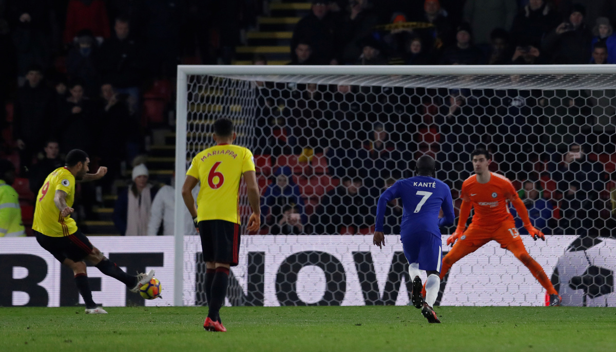 Mid-table Watford had taken the lead in the 43rd with a Troy Deeney penalty after Chelsea goalkeeper Thibaut Courtois brought down on-loan Barcelona winger Gerard Deulofeu.