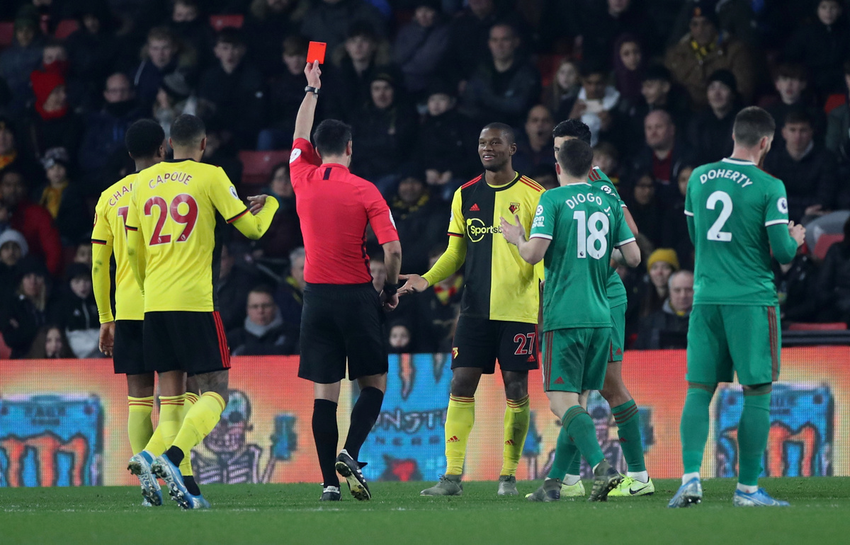 Gerard Delofeu and Doucoure fired Watford ahead before Pedro Neto pulled one back for the visitors, who failed to capitalise on a numerical advantage in the last 20 minutes after the home team's defender Christian Kabasele was sent off.