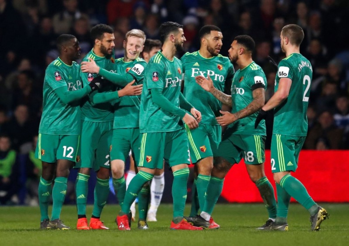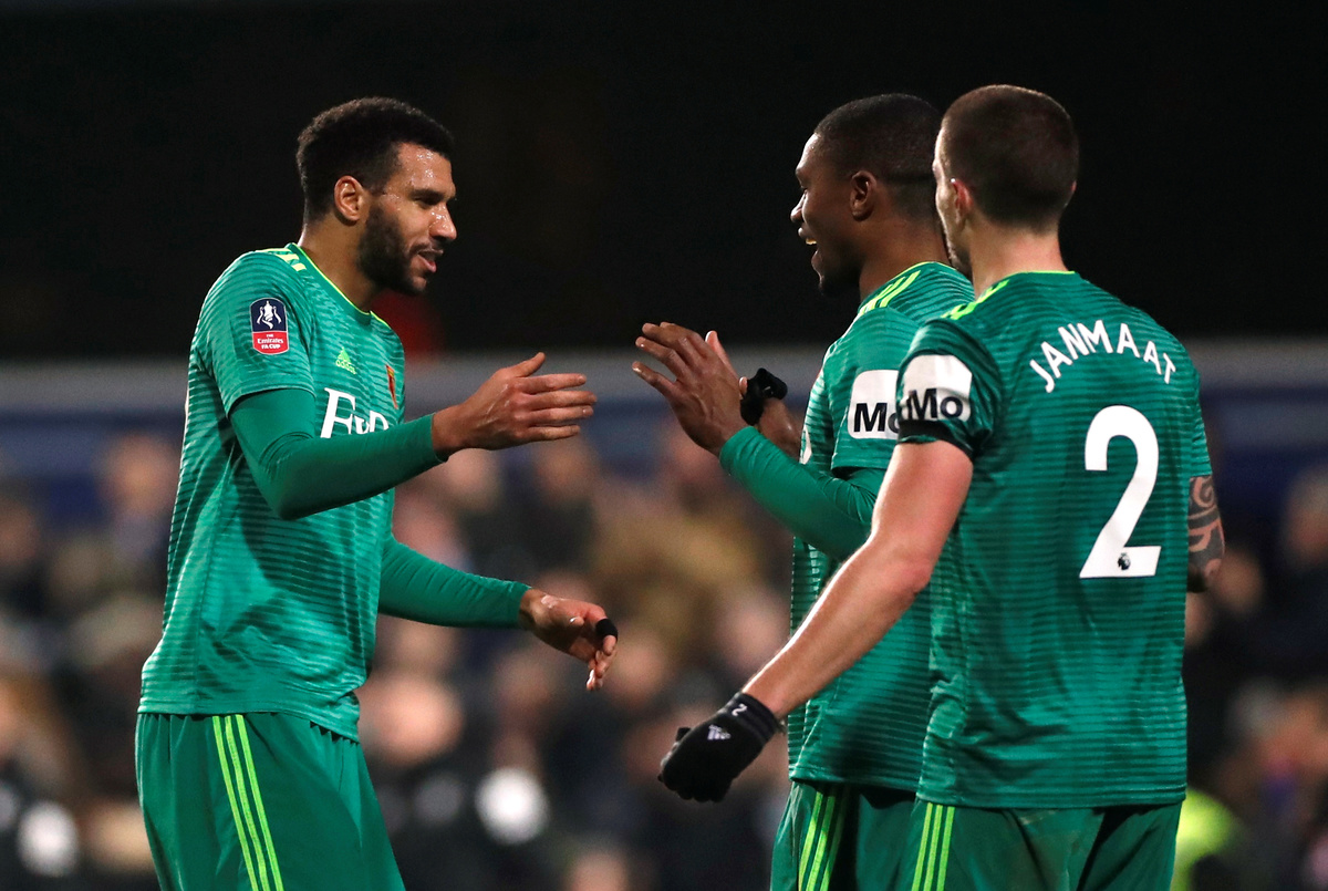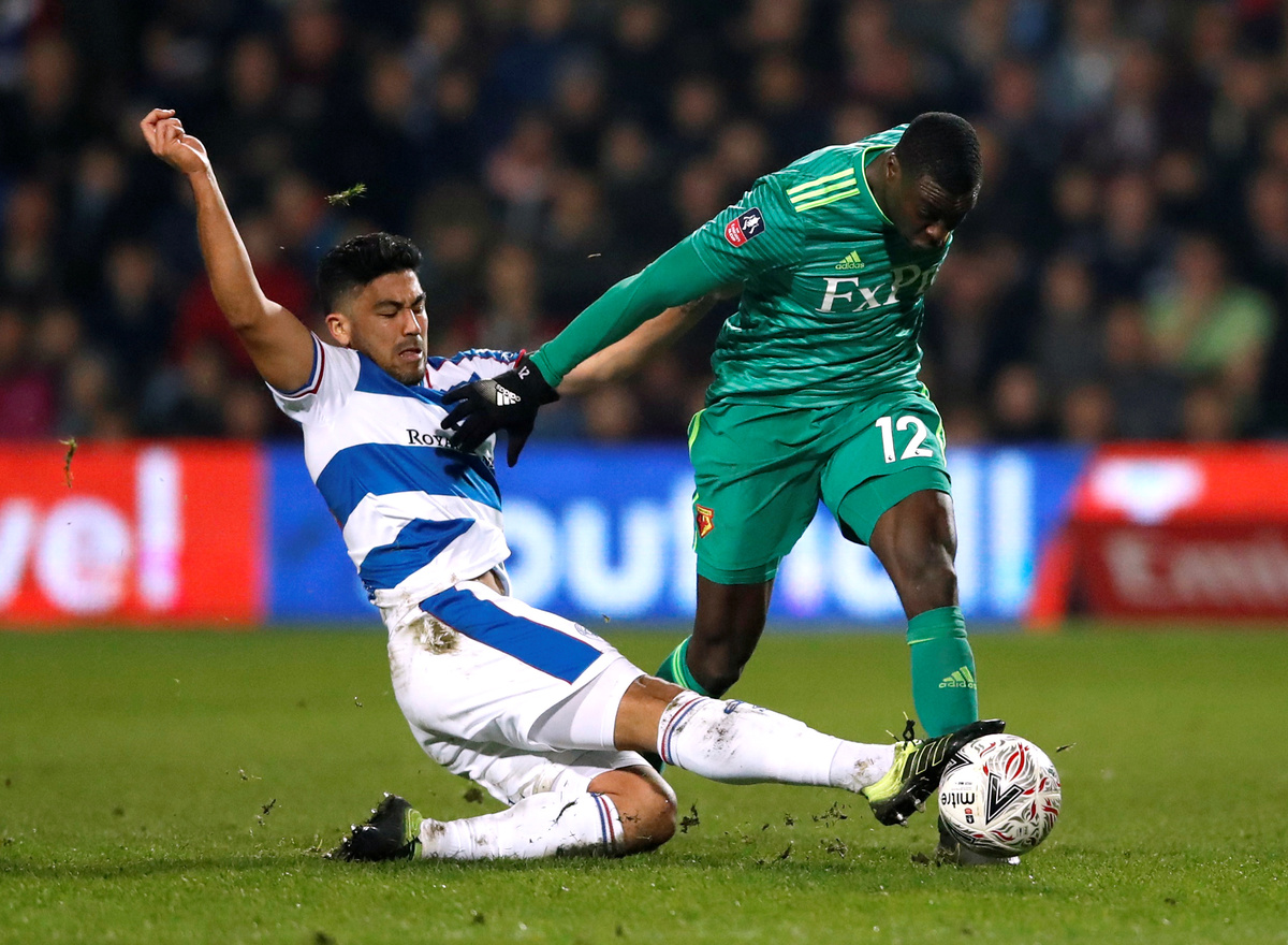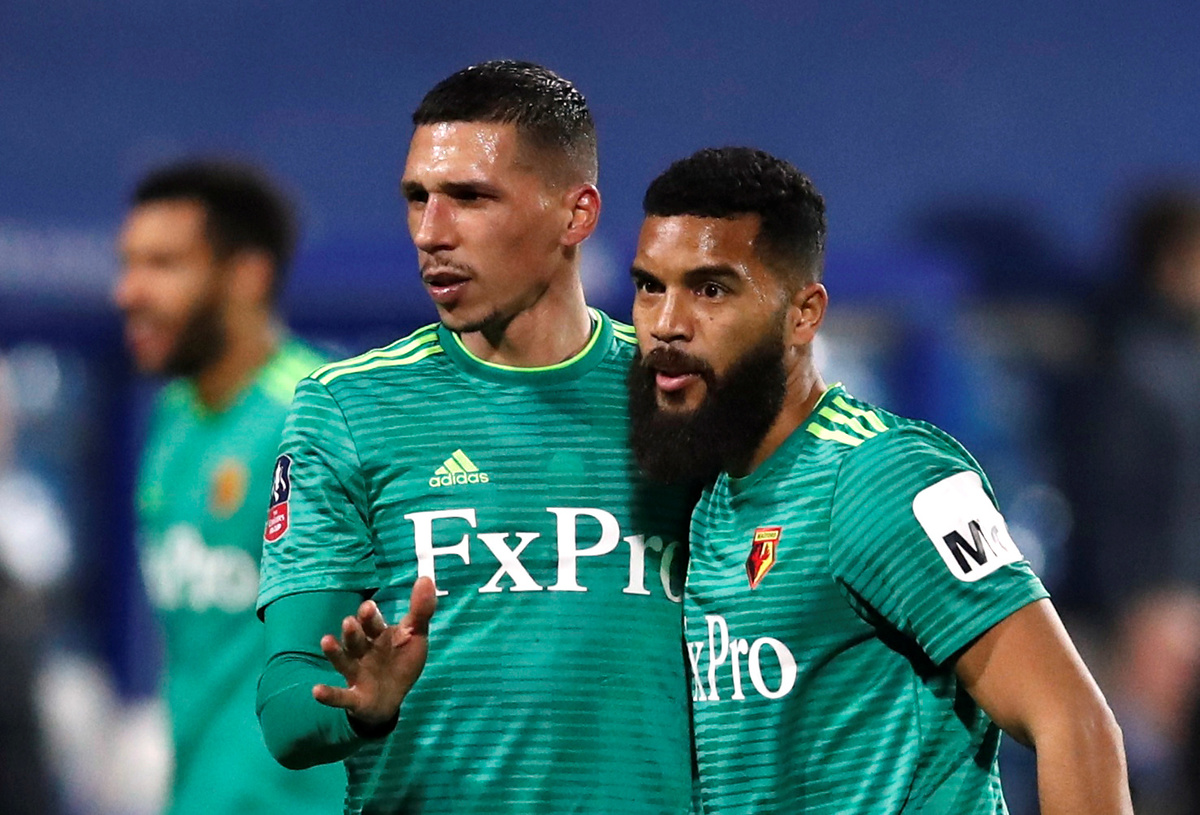 Soccer Football - FA Cup Fifth Round - Queens Park Rangers v Watford - Loftus Road, London, Britain - February 15, 2019 Watford's Jose Holebas celebrates with Adrian Mariappa at the end of the match REUTERS/David KleinSoccer Football - FA Cup Fifth Round - Queens Park Rangers v Watford - Loftus Road, London, Britain - February 15, 2019 Watford's Ken Sema in action with Queens Park Rangers' Massimo Luongo REUTERS/David KleinSoccer Football - FA Cup Fifth Round - Queens Park Rangers v Watford - Loftus Road, London, Britain - February 15, 2019 Watford's Etienne Capoue applauds the fans at the end of the match REUTERS/David KleinSoccer Football - FA Cup Fifth Round - Queens Park Rangers v Watford - Loftus Road, London, Britain - February 15, 2019 Watford's Etienne Capoue celebrates with team mates at the end of the match Action Images via Reuters/Matthew Childs