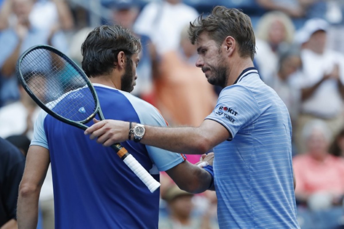 Aug 30, 2019; Flushing, NY, USA; Stan Wawrinka of Switzerland hands his broken racquet to a fan against Paolo Lorenzi of Italy (not pictured) in the third round on day five of the 2019 U.S. Open tennis tournament at USTA Billie Jean King National Tennis Center. Mandatory Credit: Geoff Burke-USA TODAY SportsAug 30, 2019; Flushing, NY, USA; Stan Wawrinka of Switzerland hits a forehand against Paolo Lorenzi of Italy (not pictured) in the third round on day five of the 2019 U.S. Open tennis tournament at USTA Billie Jean King National Tennis Center. Mandatory Credit: Geoff Burke-USA TODAY Sports