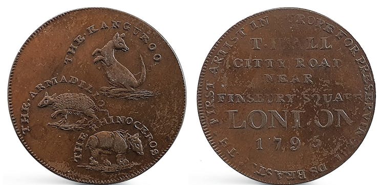In 1795, Thomas Hall of City Road near Finsbury Square in London – a well known taxidermist and exhibitor of exotic animals – issued half penny tokens depicting three exotic animals: a kangaroo (spelt “The Kanguroo”), an armadillo, and a rhinoceros.