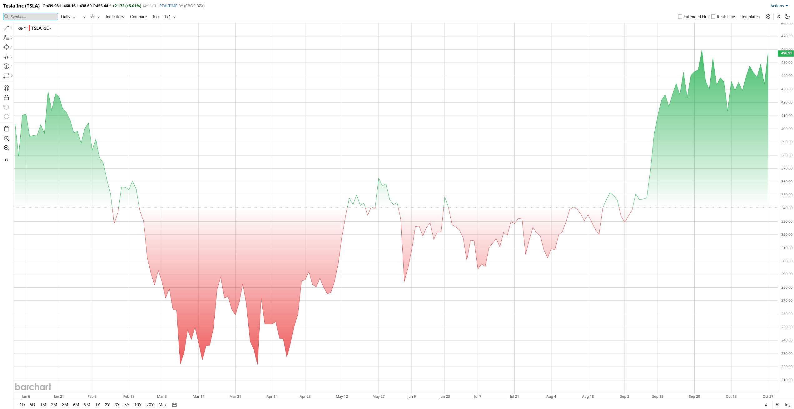 Following its Q3 earnings release, Tesla stock initially fell about 4% at the open but recovered to close down roughly 2%, as investors digested record revenue and deliveries alongside margin pressure and softer profits. Year-to-date (YTD), TSLA remains up around 13% and has surged about 61% over the past six months, rebounding from the tariff-driven selloff in April.