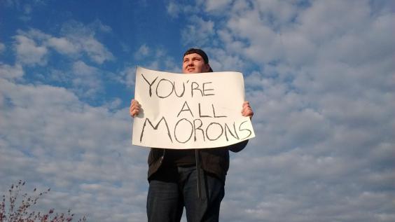 As a long line of people waited for the shuttle bus to the venue, one man called Sam, 27, stood on top of his parked car, holding up a large sign: “You are all morons.”
