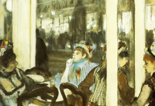 For the Impressionists, places of leisure were ideal for observing human interaction. Degas, in particular, did not shy away from presenting the undercurrents of urban life. In Women on a Café Terrace in the Evening (1877), for instance, he depicts a group of prostitutes. The woman in the middle is biting her thumb. Often interpreted as a simple sign of her boredom, art historian Hollis Clayson suggests this gesture references particular sexual activities.