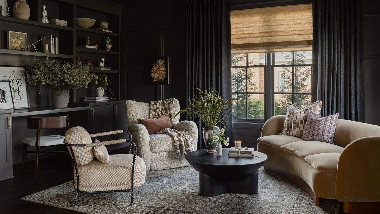 To balance the minimalist and traditional styles, a curved velvet sofa introduces a distinctly modern silhouette, softening the paneling and built-in cabinetry. 'Artwork by Sali Swalla adds depth, and color-matched drapery softens the mood and lends to the tonal character of the space,' she adds.