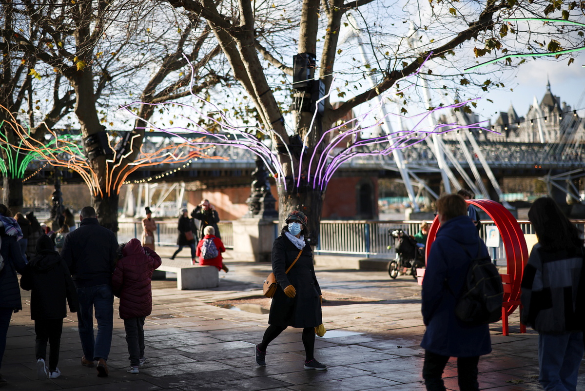 FILE PHOTO: A person wearing a protective face mask walks past seasonal illuminations on the South Bank, amid the coronavirus disease (COVID-19) outbreak in London, Britain, December 4, 2021. REUTERS/Henry Nicholls