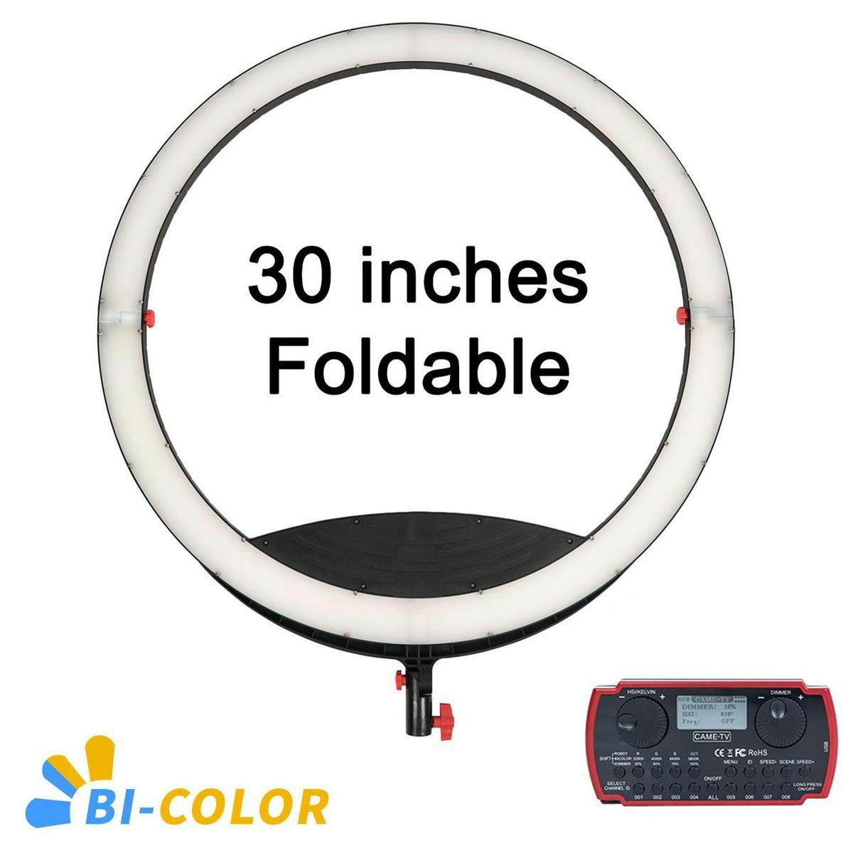Finally, some professional equipment. I don't mean to be a snob, but when it comes to lights, you get what you pay for. Here we have a very large 30-inch ring light, and get this; it folds in half. Very good for packing away in a closet, especially at this size. The materials, buttons, and dials all look professional grade, and you can use the company's app if you don't want to get up and fiddle with the settings.