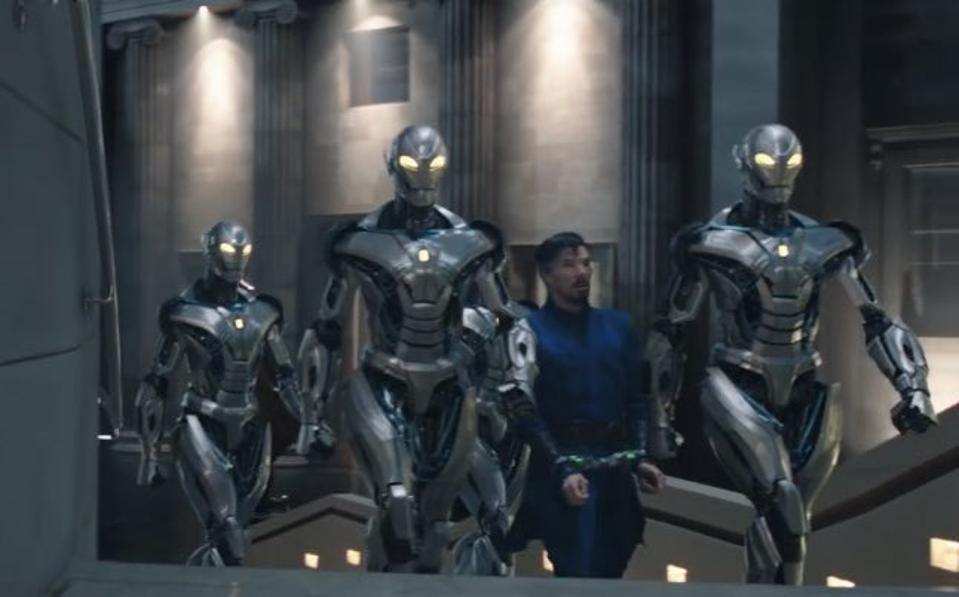 - Doctor Strange is being escorted by Ultron guards, no doubt built by some version of Tony Stark.