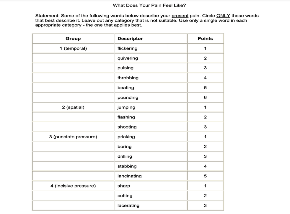 In conducting our research, we found that the ways people spontaneously talk about their experience of pain go beyond the measuring capacities of the standard assessment tools. For example, the McGill Pain Questionnaire asks people to rank each of the descriptive words such as “searing”, “pinching” and “flashing” in terms of their pain intensity.