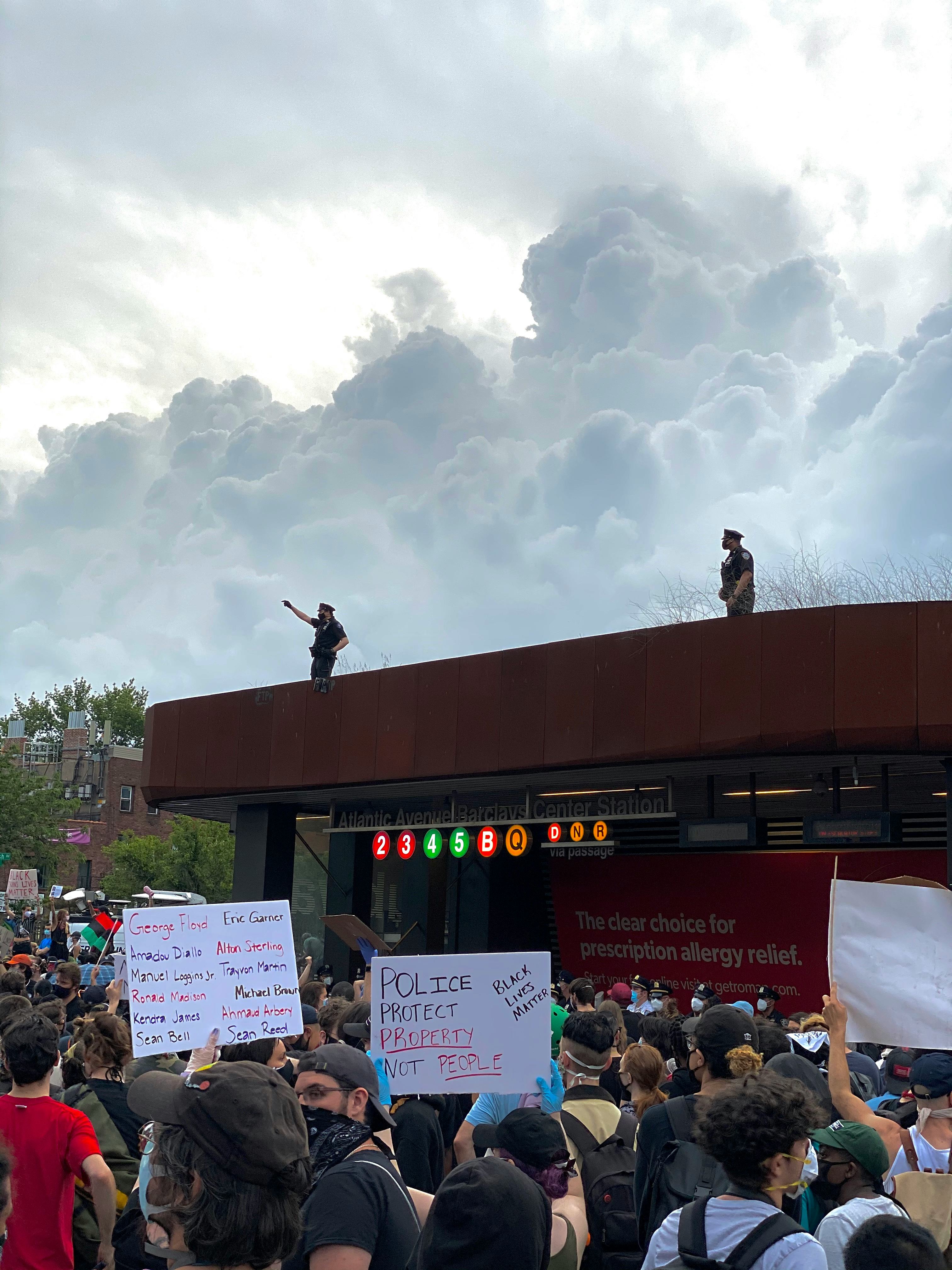 Later, protesters climbed the Barclays Center subway station and stood on its grassy roof beneath looming grey rain clouds. One wore a pig mask. Another held a yellow sign that said “Trump doesn’t care about us.” Shortly after, they were removed and replaced by police.