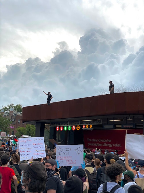 By the time I made my way into the middle of the crowd, the protest was already escalating. Masked protesters who had been yelling “George Floyd, say his name” and “I can’t breathe” moments earlier were shouting “Fuck the police.” The police were behind a metal blockade in front of the Barclays Center entrance, and the crowd pushed against it, tossing water bottles and garbage at the police.