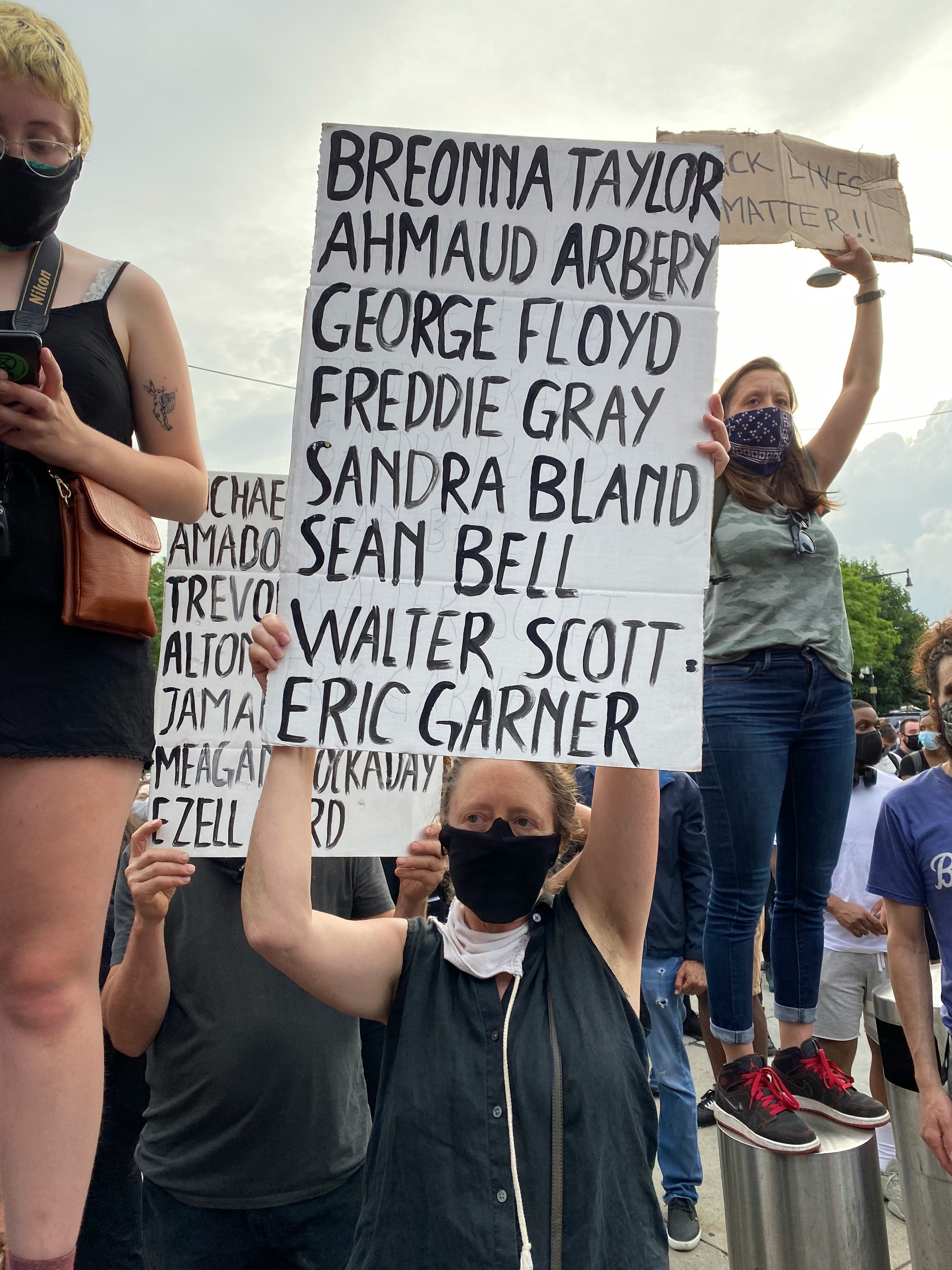 At the protest, though I set out to do some reporting, I only got a comment from one person, a middle-aged white woman with a sign that had the names of Black people who had been killed painted in black.