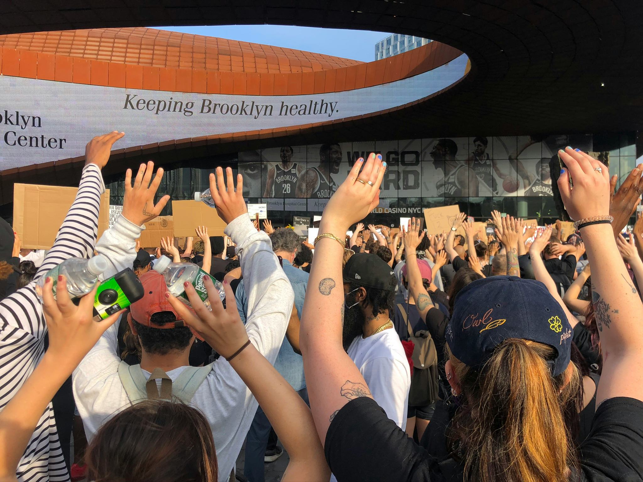 By 6 p.m., the rusted open arch above Barclays Center was filled with hundreds of people, some spilling onto Flatbush Avenue where NYPD officers in neon green and navy uniforms on bicycles had lined the street. A police helicopter circled the area.