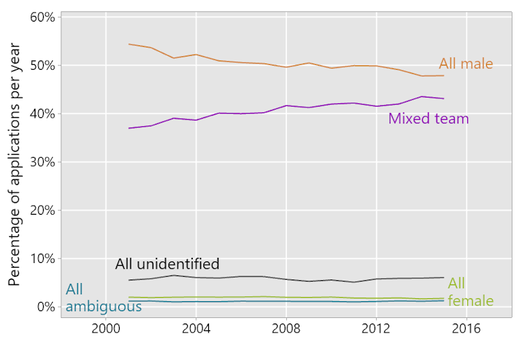 To do so, we analysed 309,544 patent applications from across a 15-year period (2001-2015), and categorised close to one million inventors’ names based on whether they sounded male or female.