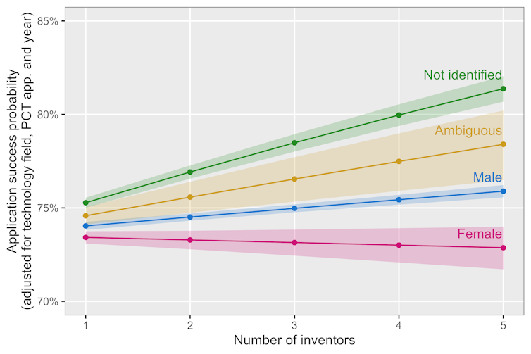 Also, as the number of males on a team increased, so did the odds of the team being granted a patent – whereas adding a female had a negligible impact. In other words, bigger teams of inventors had more patent success, unless the additional inventors had female-sounding names.