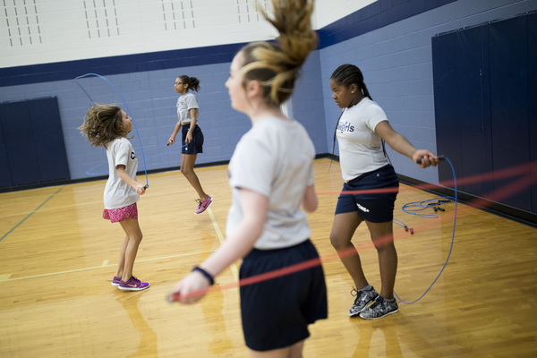 Inside, kids lift the weighted bags over their heads, throwing them onto the wooden floor. Booms like thunder echo through the building.