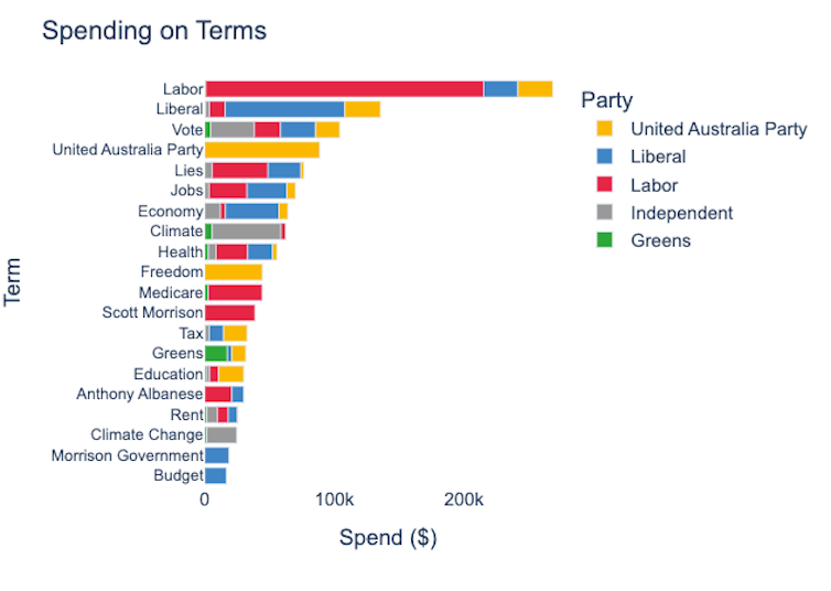 Negative campaigning is showing up, too. One of the top terms appearing in ads from the major parties is “lies”.