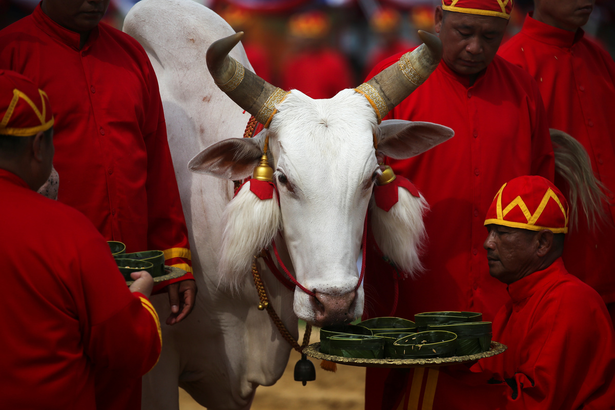 Draped in red and gold, a pair of light-skinned royal oxen, named "Perm" and "Poon", which together form the word "multiply" in Thai, pulled a plough round a ceremonial field nine times, accompanied by court Brahmins and government officials.