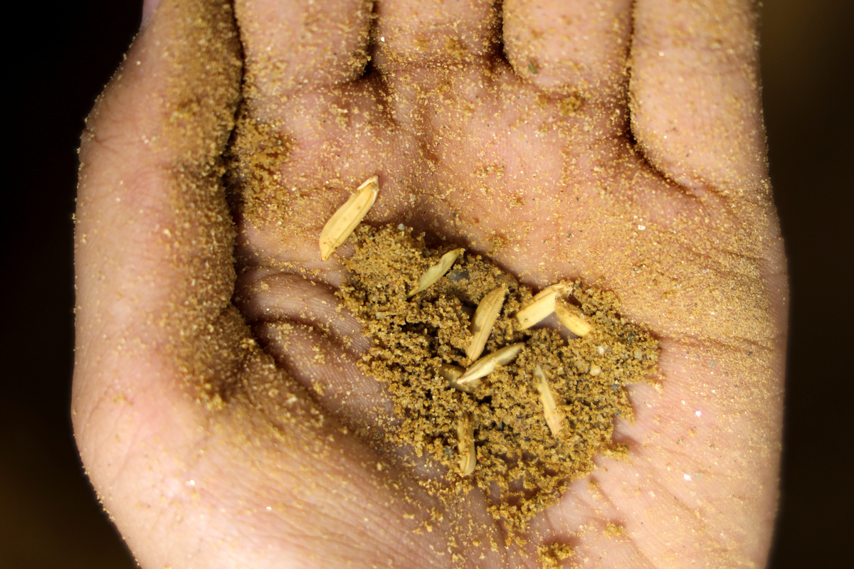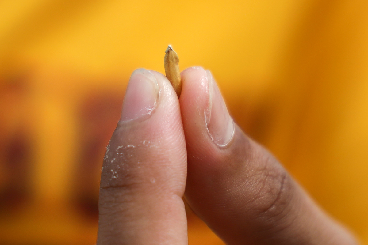 A woman shows a collected rice seed during the annual royal ploughing ceremony in central Bangkok, Thailand, May 9, 2019. REUTERS/Athit Perawongmetha
