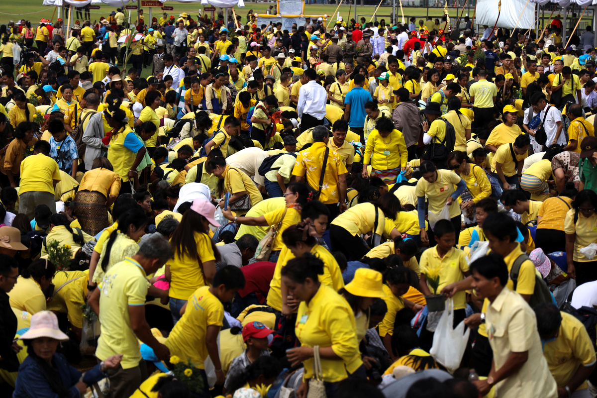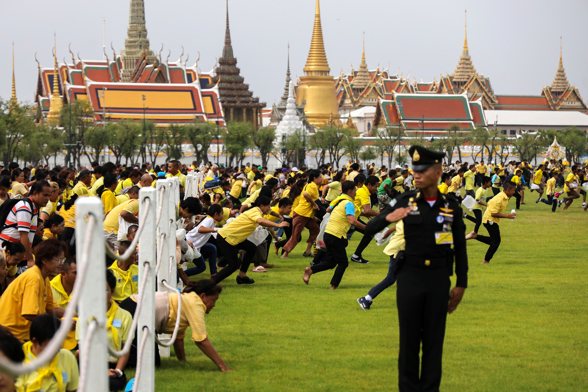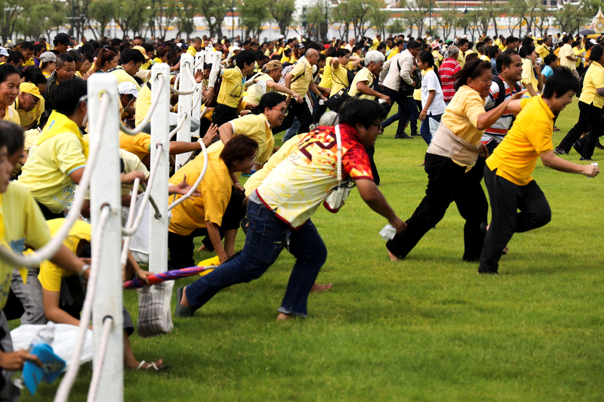 Hundreds of Thais watched the ceremony from outside the field, and broke through fences at the end of the ritual to scramble for grains of rice scattered during the event.