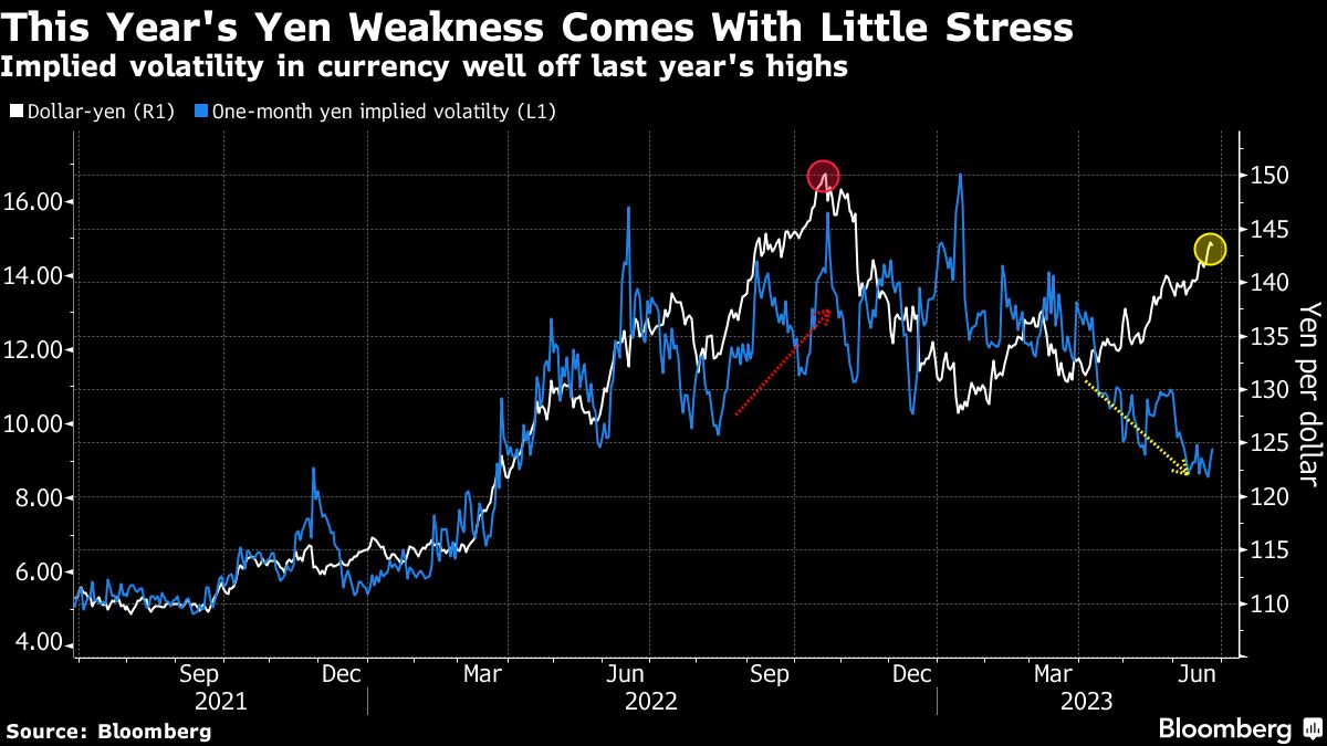 Japan has a long-stated focus on the pace of declines rather than any particular target. When officials stepped into markets as the currency approached 146 in September and 152 in October, on each occasion the dollar had moved by more than 2 yen in less than 24 hours. Volatility is at much lower levels this year.