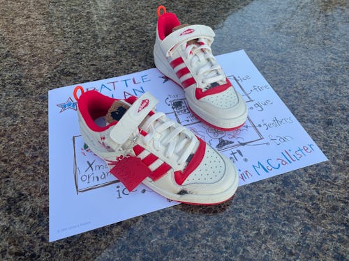 As a fan of both the footwear and the film, I couldn’t wait to try out these Home Alone sneakers. Unpacking the shoes was really like opening a Christmas gift: While they arrived in Adidas’ classic blue box, the packaging came wrapped in paper detailing Kevin’s defense plan. A note, “handwritten” by the protagonist, finished off the wrapping, reading, “Merry Christmas you filthy animal!”