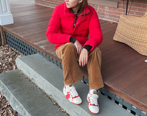 To properly style my Home Alone kicks, I took a hint from McCallister’s ‘90s look and paired the sneakers with a set of corduroy-esque pants, which matched the shoe’s chenille tongue tags. Channeling Kevin’s signature red sweater, I opted for a red puffer jacket, coordinating the color with the red details on the sneakers.