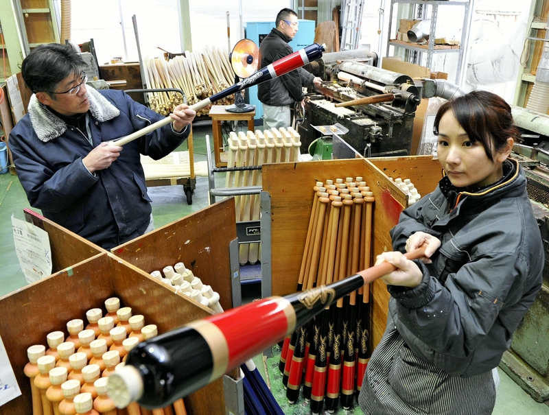 Ahead of the start of the baseball season, employees at a factory of major bat manufacturer Lonwood Co. in Nanto, Toyama Prefecture, examine the products before they are shipped during the busiest time of the year. As the city's humidity is suitable for processing wood for bats throughout the year, manufacturing has flourished here since before World War II. The factory produces about 300 bats per day out of maple wood from North America, including made-to-order bats for professional baseball players.