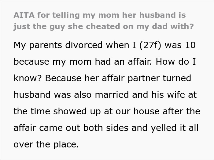 The poster was just 10 years old when her mom cheated on her dad and later married her affair partner