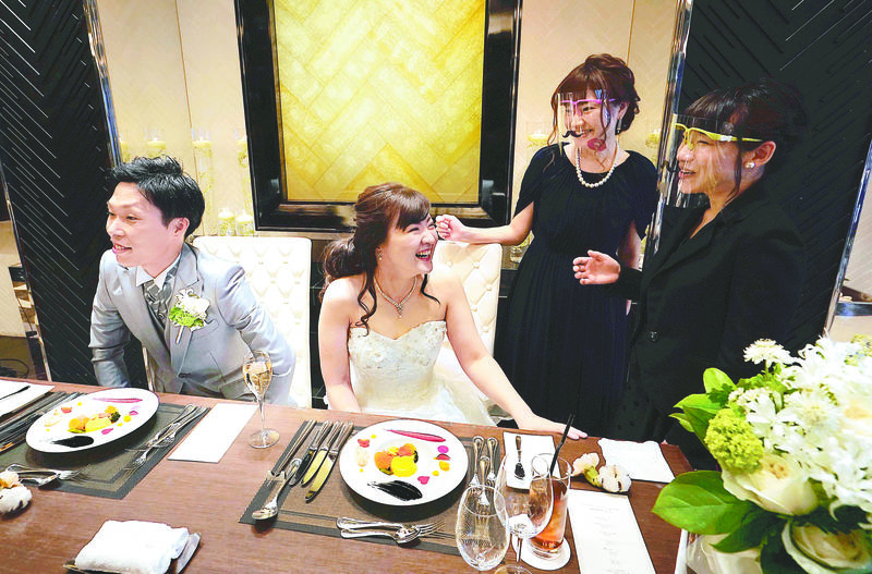 The wedding reception, which was postponed because of the coronavirus pandemic, was held at Lagunaveil Osaka in Osaka on Oct. 17. There were partitions set up between the seats at the tables, and antibacterial hand towels were available to guests as well.