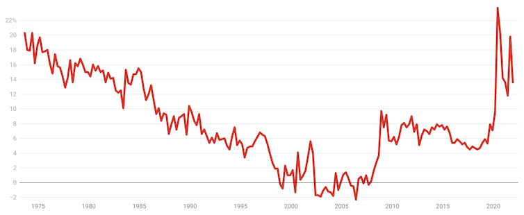The saving ratio soared to a record high early in the pandemic, fell during the 2020 recovery, soared again during the 2021 lockdowns, and fell in the December quarter.