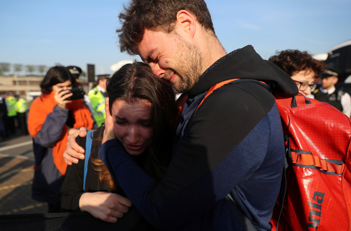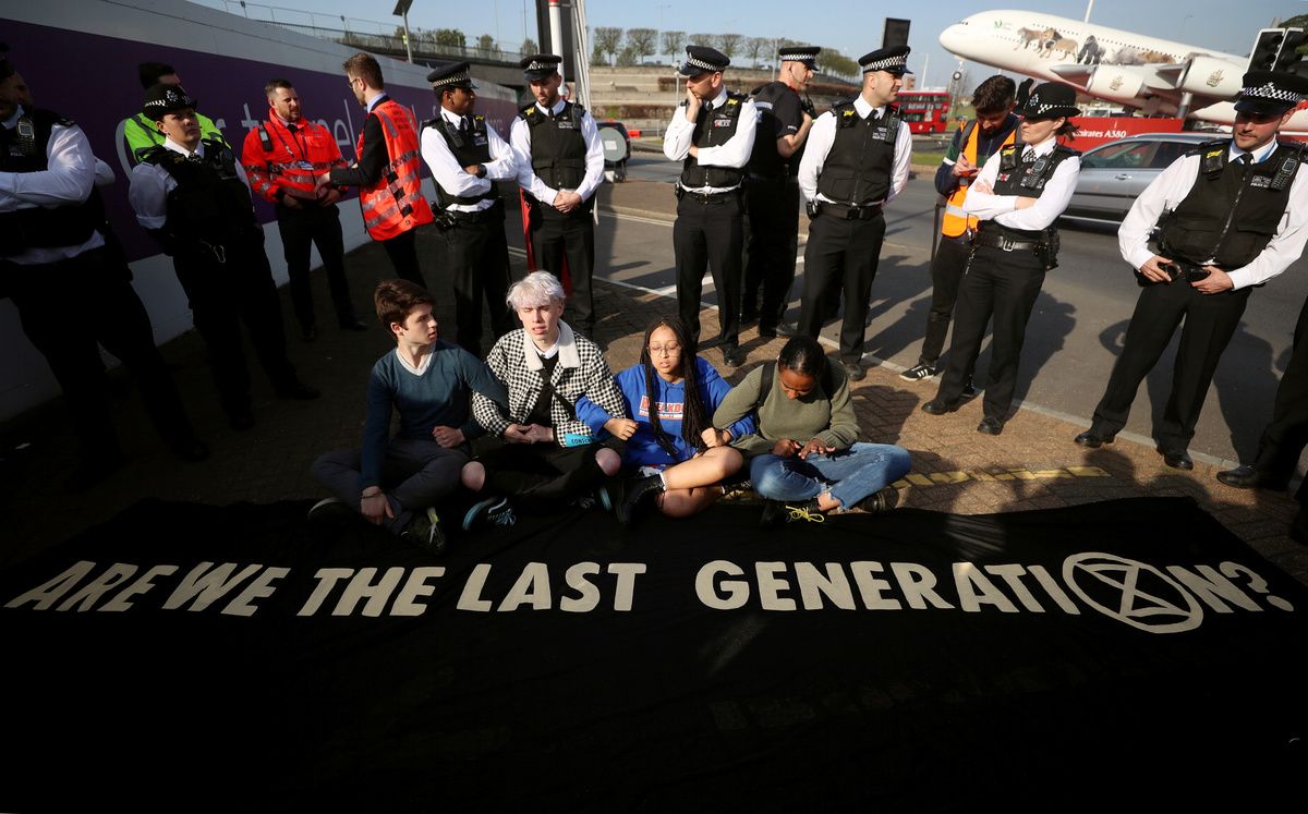 Climate change activists react during an Extinction Rebellion protest outside Heathrow Airport in London, Britain April 19, 2019. REUTERS/Simon Dawson