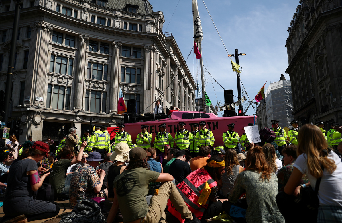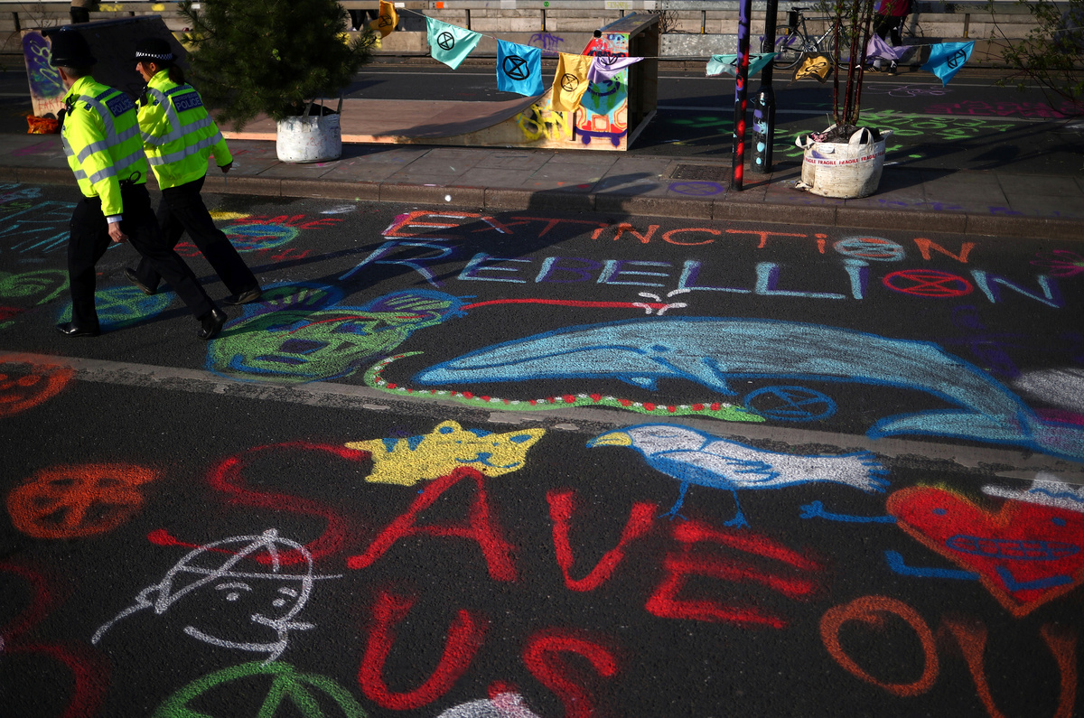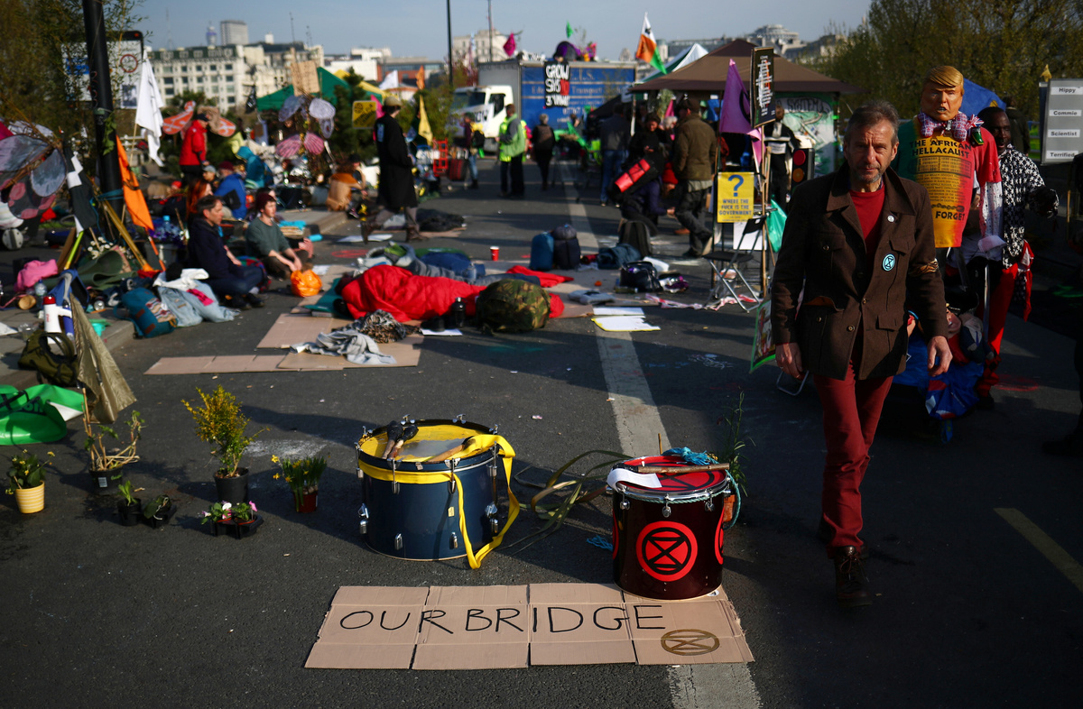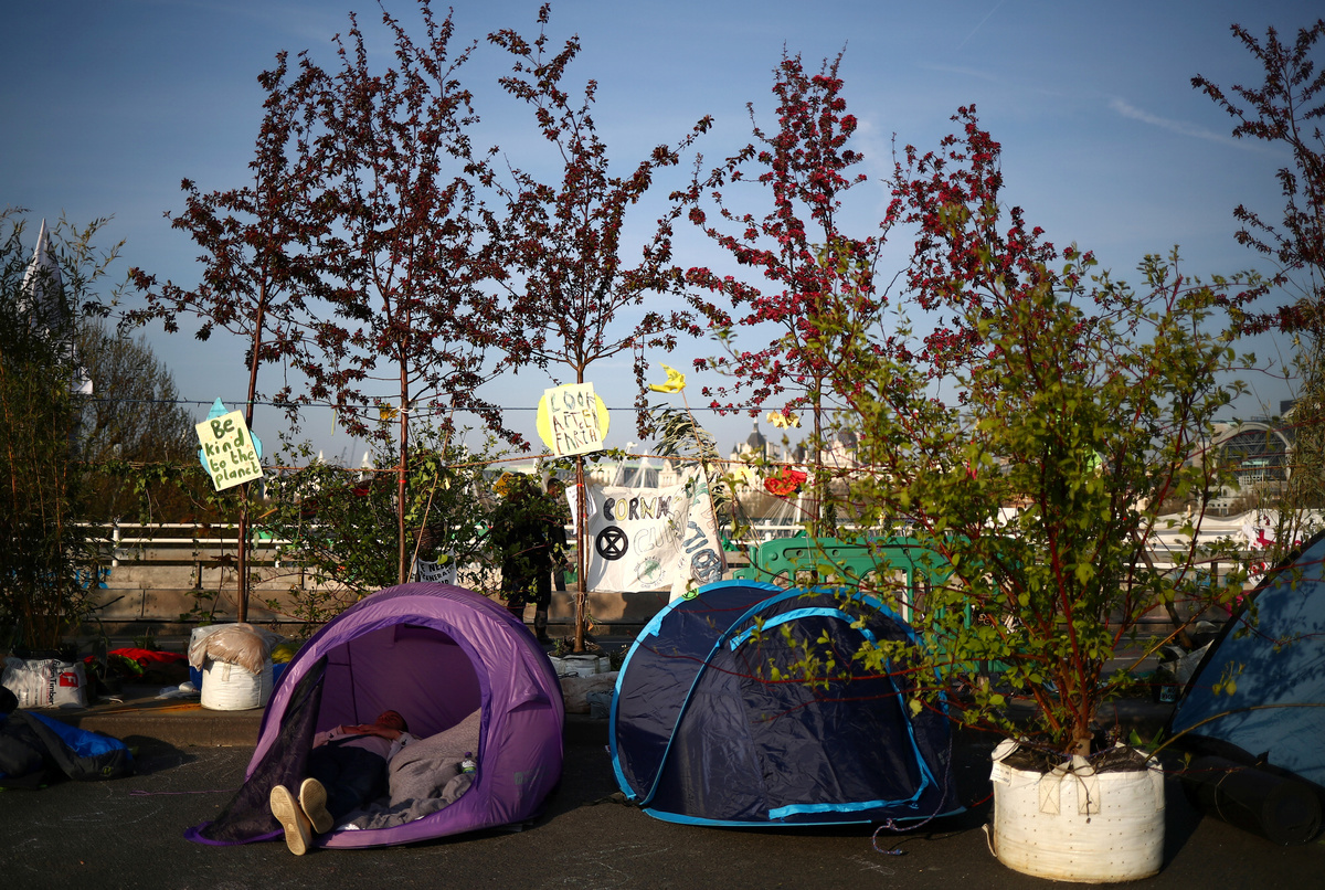 Actor Emma Thompson takes part in the Extinction Rebellion protest at Oxford Circus in London, Britain April 19, 2019. REUTERS/Hannah McKayActor Emma Thompson takes part in the Extinction Rebellion protest at Oxford Circus in London, Britain April 19, 2019. REUTERS/Hannah McKayA climate change activist reacts during an Extinction Rebellion protest outside Heathrow Airport in London, Britain April 19, 2019. REUTERS/Simon DawsonClimate change activists are seen during an Extinction Rebellion protest at Waterloo Bridge in London, Britain April 19, 2019. REUTERS/Hannah McKayClimate change activists react during an Extinction Rebellion protest outside Heathrow Airport in London, Britain April 19, 2019. REUTERS/Simon DawsonA climate change activist reacts during an Extinction Rebellion protest outside Heathrow Airport in London, Britain April 19, 2019. REUTERS/Simon DawsonPolice officers are seen during a protest during an Extinction Rebellion protest at Waterloo Bridge in London, Britain April 19, 2019. REUTERS/Hannah McKayA climate change activist is seen inside a tent during an Extinction Rebellion protest at Waterloo Bridge in London, Britain April 19, 2019. REUTERS/Hannah McKayA climate change activist attends an Extinction Rebellion protest at Waterloo Bridge in London, Britain April 19, 2019. REUTERS/Hannah McKayClimate change activists attend an Extinction Rebellion protest at Waterloo Bridge in London, Britain April 19, 2019. REUTERS/Hannah McKayAn Extinction Rebellion banner hangs on the Waterloo Bridge during an Extinction Rebellion protest in London, Britain April 19, 2019. REUTERS/Hannah McKayClimate change activists are seen on the Waterloo Bridge during an Extinction Rebellion protest in London, Britain April 19, 2019. REUTERS/Hannah McKay