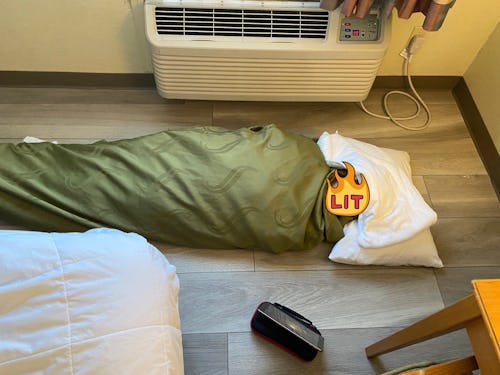 After that, I put on a layer of Sweet Sweat, a topical gel intended to help you sweat more. Then I changed into my sweat suit. A teammate wrapped me in layers of towels and blankets until I was swaddled on the floor in what’s known in the fight world as the “burrito.” I laid there for 45 minutes next to a heater on full blast (again, it was June). A teammate warned me that at some point, I’d feel like my heart was pounding uncontrollably, but that it was a normal part of being in the burrito. Eventually, I sweat so much that it felt like I was lying in a puddle. When I finished, I lifted my shirt, and liquid poured onto the floor.