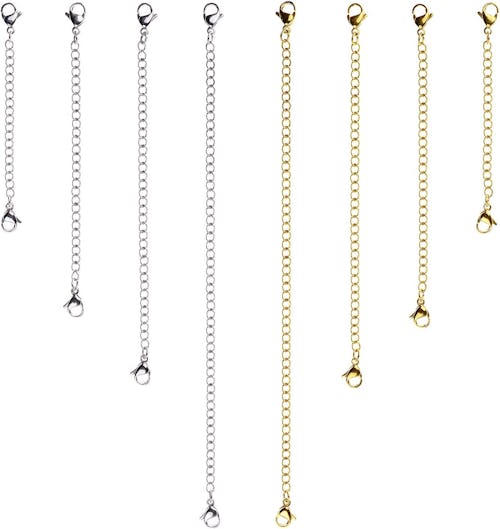 Does your favorite necklace not quite work with your favorite outfit? Different necklines require different jewelry lengths — adjust the length of your jewelry with these alloy extension chains. This set includes eight pieces in four lengths (2, 3, 4, and 6 inches) and two colors (gold and silver). Easy-to-use lobster claw clasps make it simple to attach to any necklace, bracelet, or anklet.