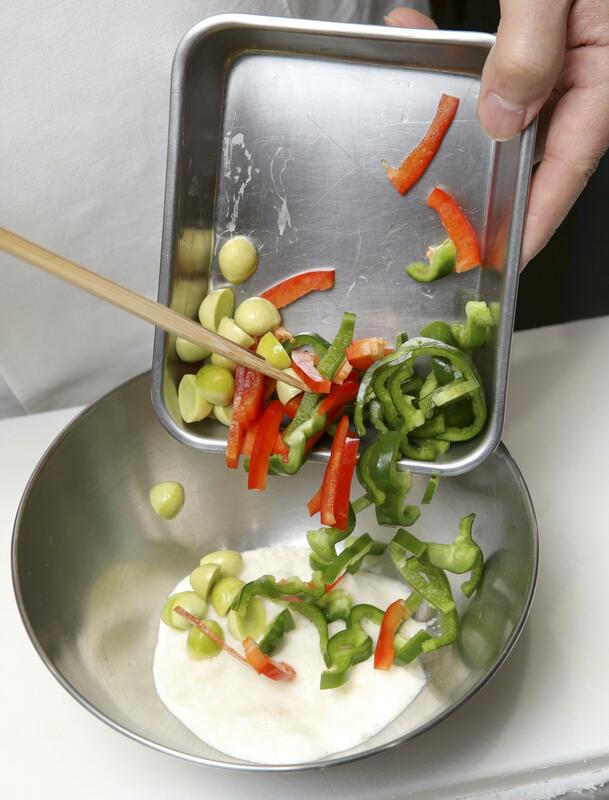 5. Place yamato-imo, green and red bell peppers, and ginkgo nuts in a bowl, mix, divide into two equal portions and shape appropriately.