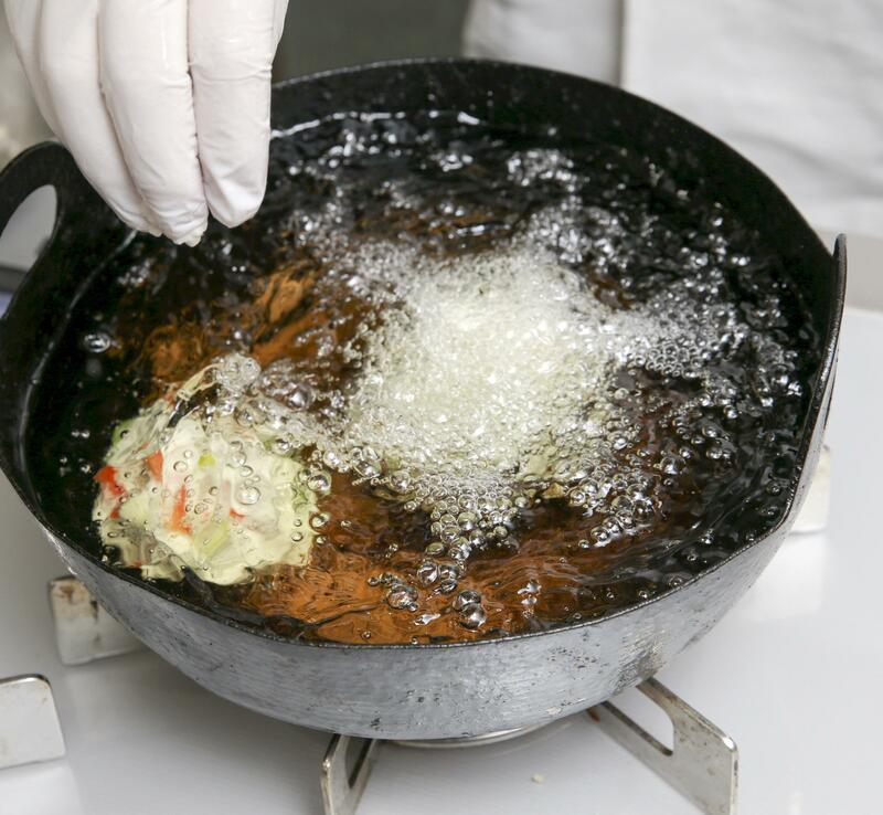 6. Deep-fry the portions slowly in oil at 160 C until the surface becomes golden brown. Be careful not to burn.
